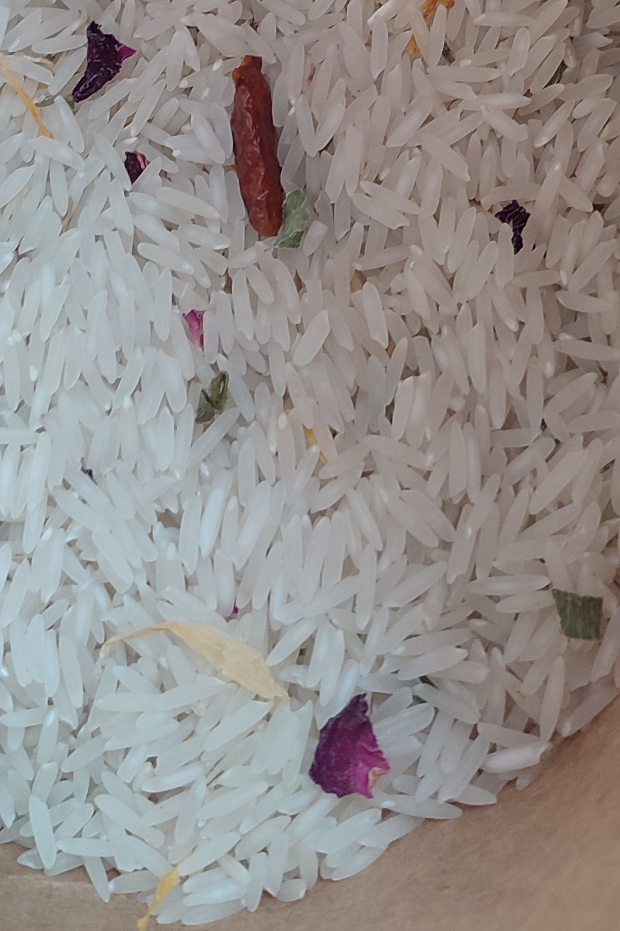 Arroz basmati tailandés de La Despensa de Cercedilla es una mezcla exquisita con un toque picante. Combina la suavidad del arroz basmati con los aromas florales de los pétalos de rosa y las flores de caléndula, con un toque picante de la cayena. Producto 100% artesanal y natural con cuidado y amor, sin añadir aditivos, colorantes ni conservantes. Nos esforzamos especialmente en seleccionar las mejores materias primas para garantizar la máxima calidad de los mismos.