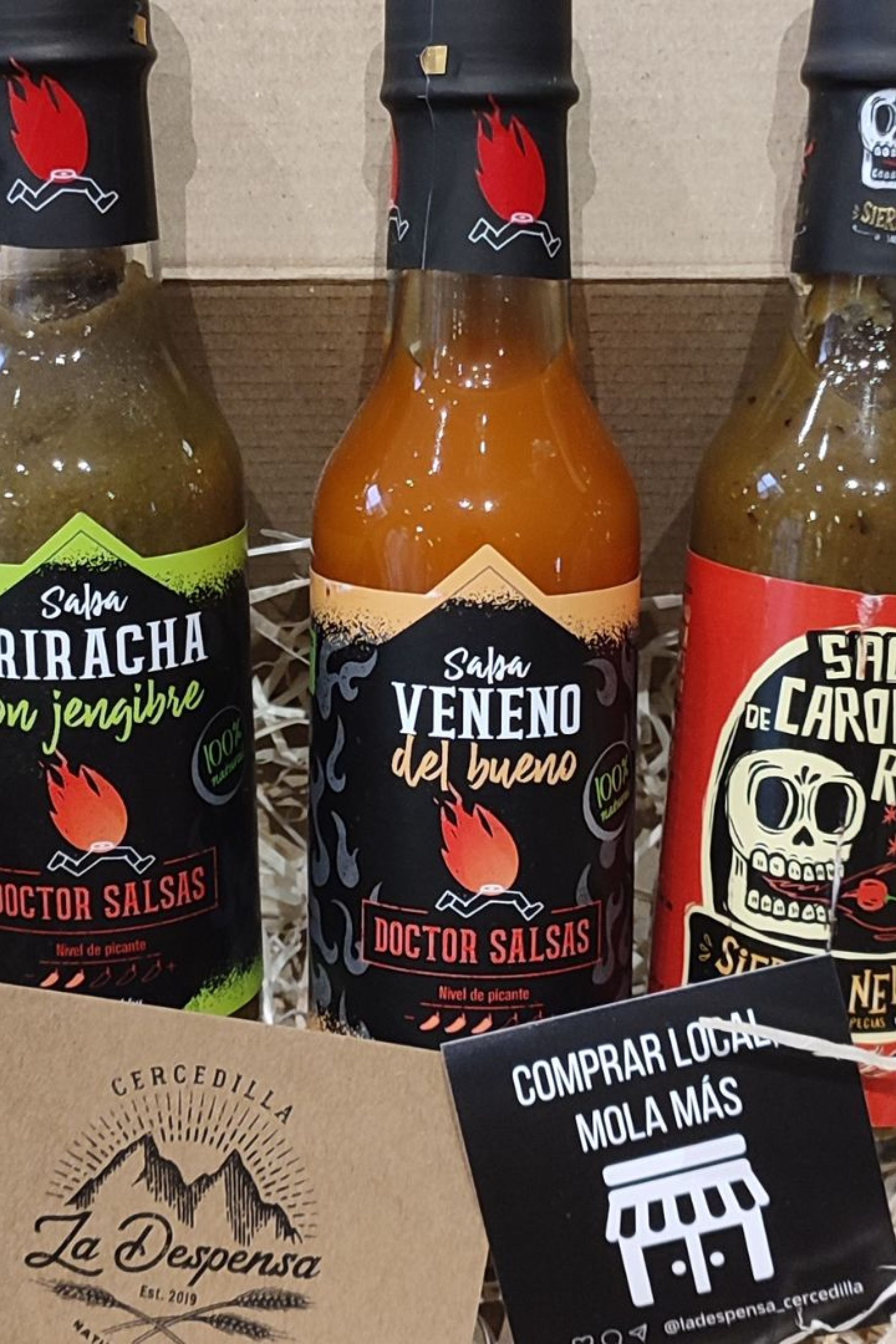 Esta caja contiene una selección de cuatro salsas picantes Doctor Salsas. Caja de regalo ideal para fanáticos del picante. Se presenta en una caja de cartón reciclado e incluye pegatinas de La Despensa.