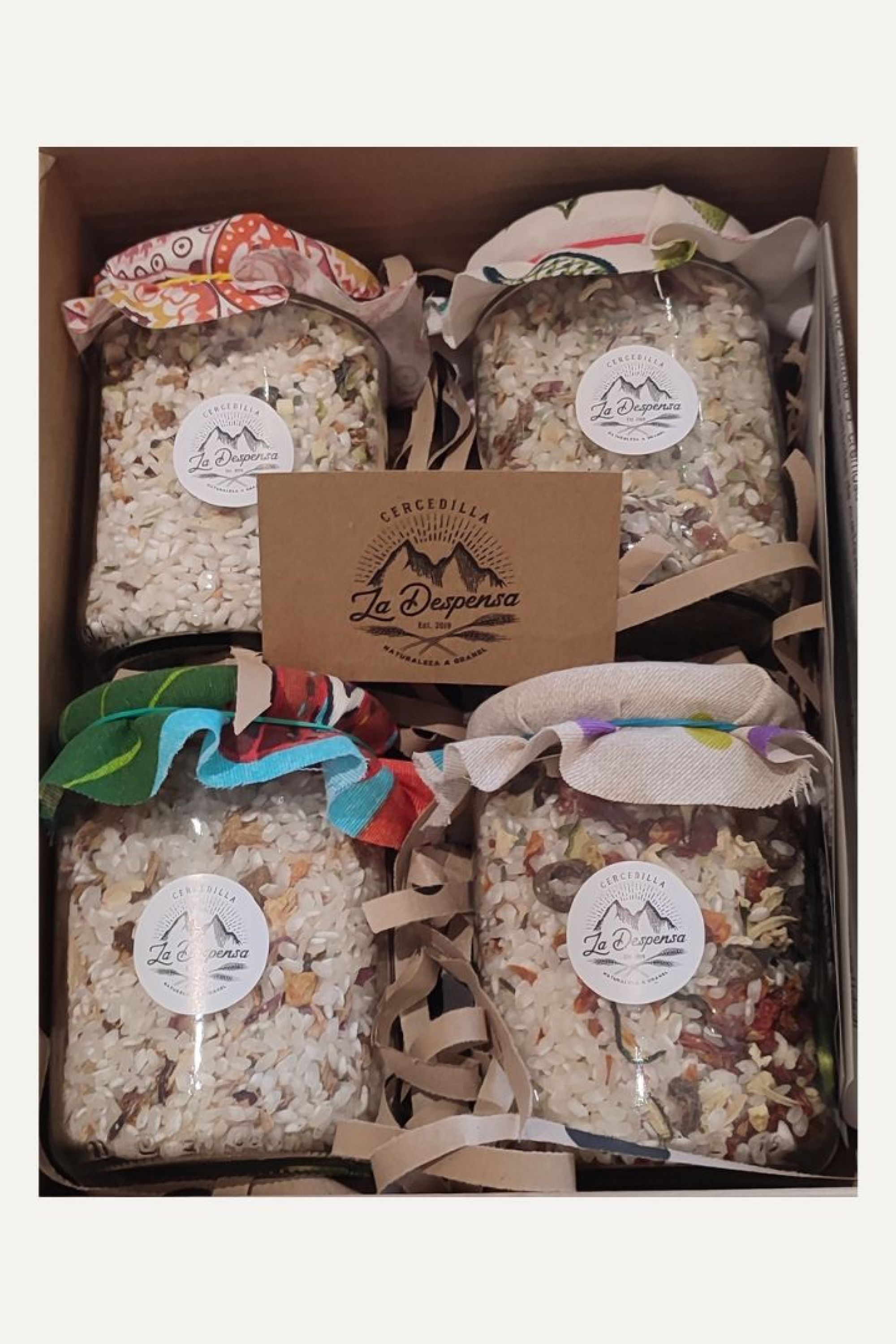 Este pack contiene una selección de cuatro risottos variados de gran calidad. Un regalo ideal para amantes del arroz y las setas.