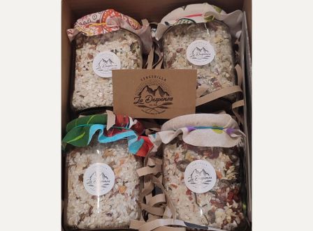 Los risottos serán variados según disponibilidad: boletus y trufa, shiitake y calabaza, trompeta y frambuesa, rebozuelo y espárragos, mediterráneo, toscana… Nuestros risottos provienen de una pequeña empresa familiar donde trabajan productos 100% naturales. Sin añadir aditivos, colorantes ni conservantes. Se encuentra en el Prepirineo catalán, en la comarca del Berguedà. Gracias a esto normalmente pueden disfrutar de una buena y larga temporada de setas. Hacen un gran esfuerzo en seleccionar las mejores materias primas para garantizar la máxima calidad de estas mezclas. Con constancia y dedicación crean y elaboran artesanalmente productos típicos de su comarca, rica en setas: productos tradicionales, originales, novedosos, de calidad y de confianza.