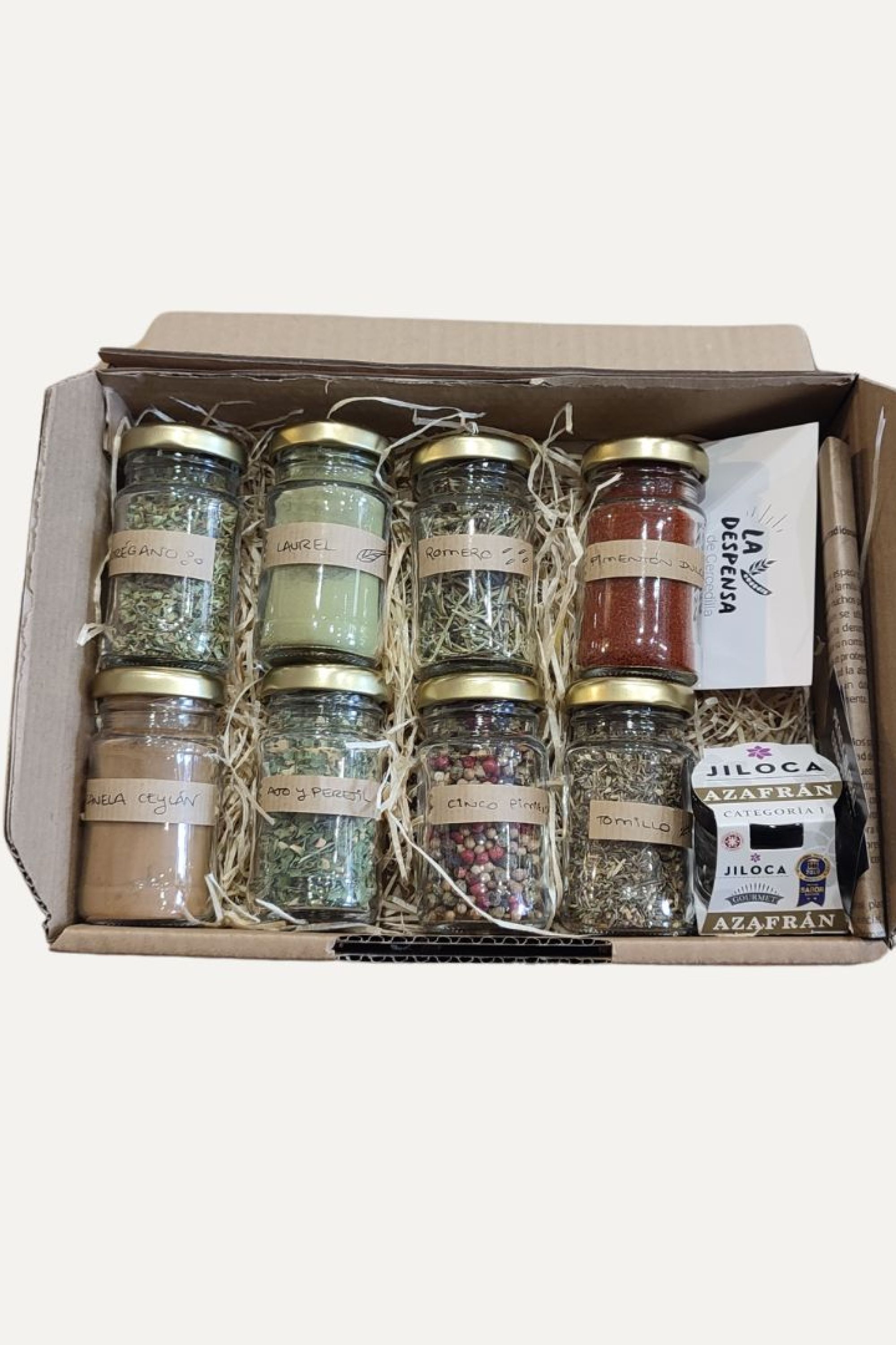 Este pack contiene una selección de especias tradicionales para disfrutar de los platos de toda la vida. Contiene: azafrán de Monreal del Campo, ajo y perejil, orégano, laurel, cinco pimientas, tomillo, canela, cayenas, pimentón dulce ahumado de La Vera y romero.