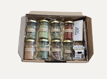 Este pack contiene una selección de especias tradicionales para disfrutar de los platos de toda la vida. Contiene: azafrán de Monreal del Campo, ajo y perejil, orégano, laurel, cinco pimientas, tomillo, canela, cayenas, pimentón dulce ahumado de La Vera y romero.