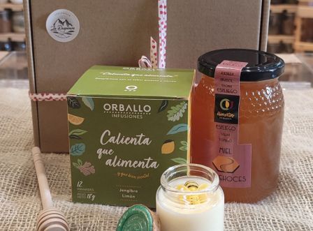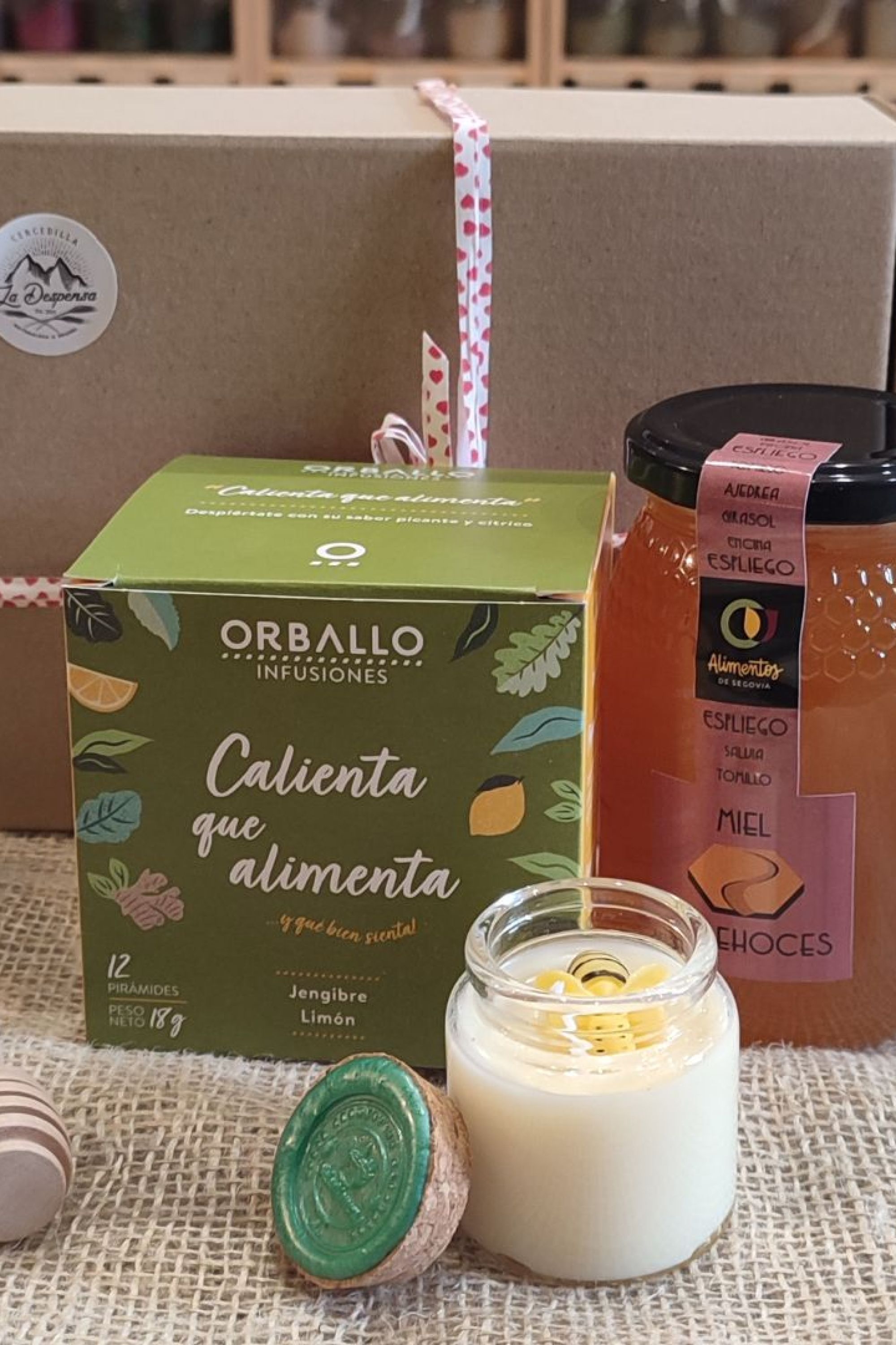 Esta caja de regalo contiene una infusión ecológica de Orballo, un tarro de miel de Enrehoces (Segovia), una cuchara de madera artesana para servir la miel y una vela artesanal hecha con mucho mimo por VelarNatura.