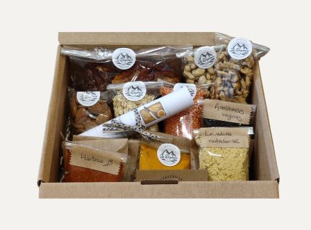 Caja de cartón reciclado con los ingredientes y recetas para elaborar originales patés en casa.