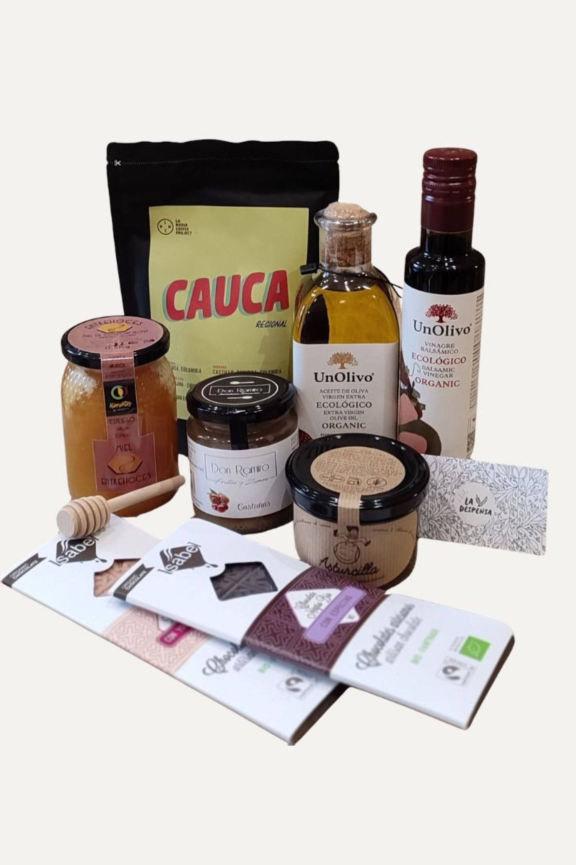 Los productos que contiene esta caja de regalo son de gran calidad y todos provenientes de empresas muy especiales y locales. Entre ellos puedes encontrar el aceite ecológico de Un Olivo, se elabora mimando la tierra, escuchando a la luna, a las estrellas; vigilando los ciclos del día o las estaciones… Se trata de una técnica de cultivo que rescata costumbres ancestrales y que desde una dimensión espiritual buscan un equilibrio en armonía entre el hombre y la tierra. El café es de especialidad de La Noria Coffee Project. Es una colaboración entre productor, tostador y cafetería de especialidad. Los cafés son tostados en Madrid cada semana por Barry de Randall Coffee Roasters, quien se encarga de realizar un tueste medio ideal para resaltar las cualidades de nuestro café, ofreciendo siempre un producto fresco y de calidad. Asturcilla es una crema de cacao y avellanas elaborada en Cabranes, Asturias. Es especial por su sabor pero también por los valores que cuidan al hacerla: tratan de aportar al entorno, priorizar los cuidados, cooperar con otros proyectos, fomentar un mundo rural vivo, sostener nuevos modelos laborales y respetar los límites del planeta.