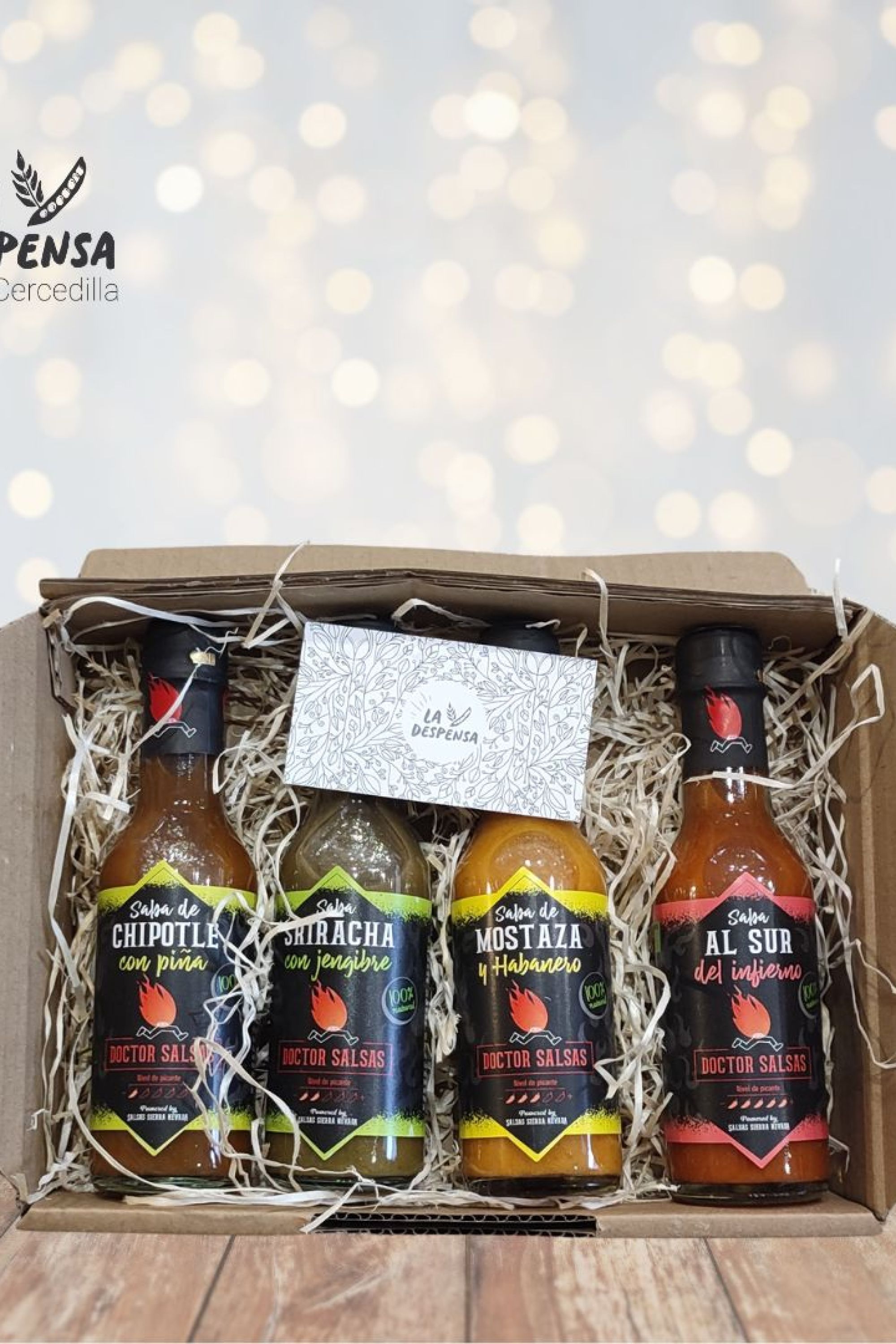 Esta caja contiene una selección de cuatro salsas picantes Doctor Salsas. Caja de regalo ideal para fanáticos del picante. Se presenta en una caja de cartón reciclado e incluye pegatinas de La Despensa.