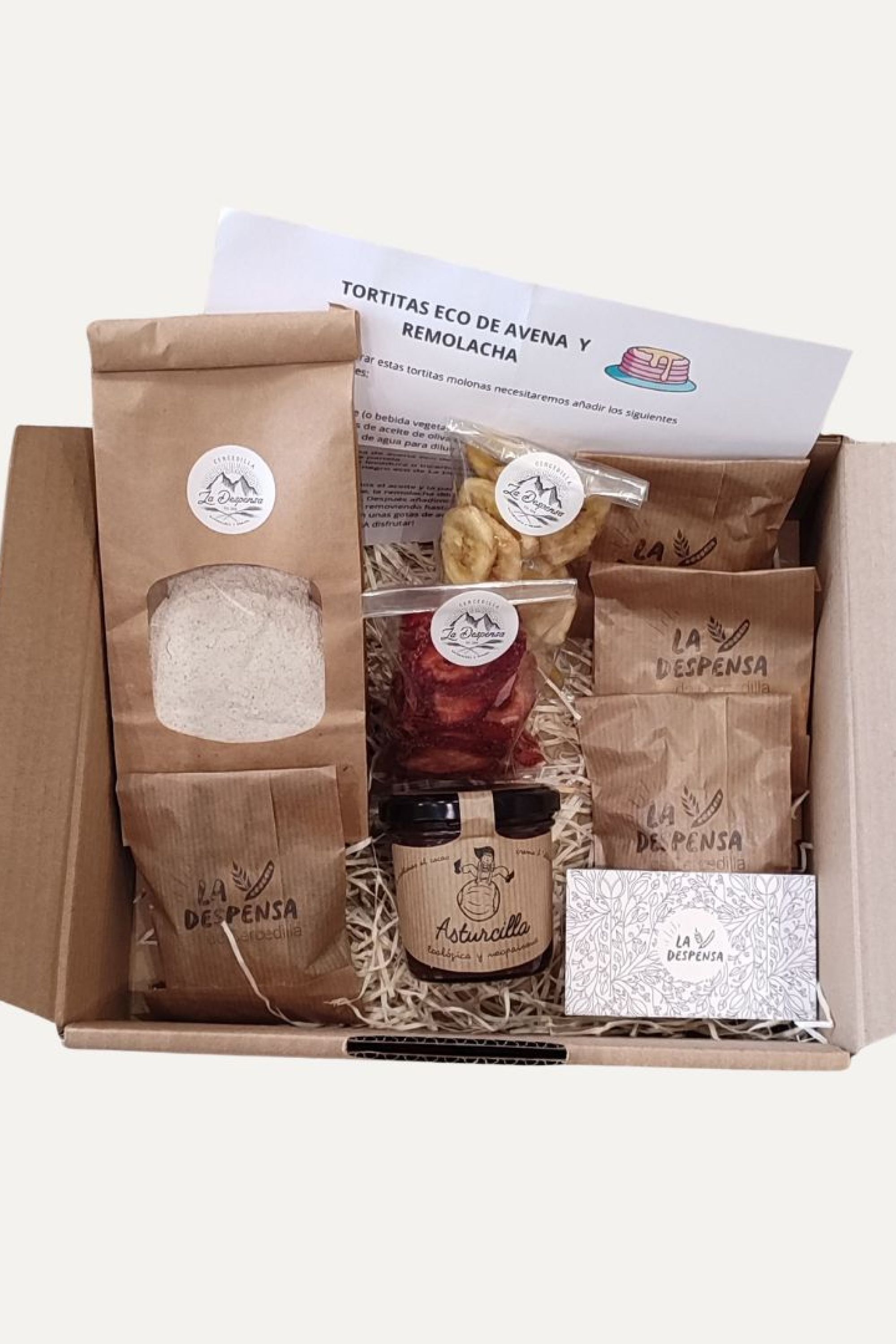 Incluye además un tarro de crema de avellanas, leche y cacao de Asturcilla y toppins para decorar las tortitas: remolacha en polvo, semillas molidas con frutos rojos, nueces, plátano, fresas y semillas de cáñamo. Incluye la receta para elaborar tortitas con Asturcilla.