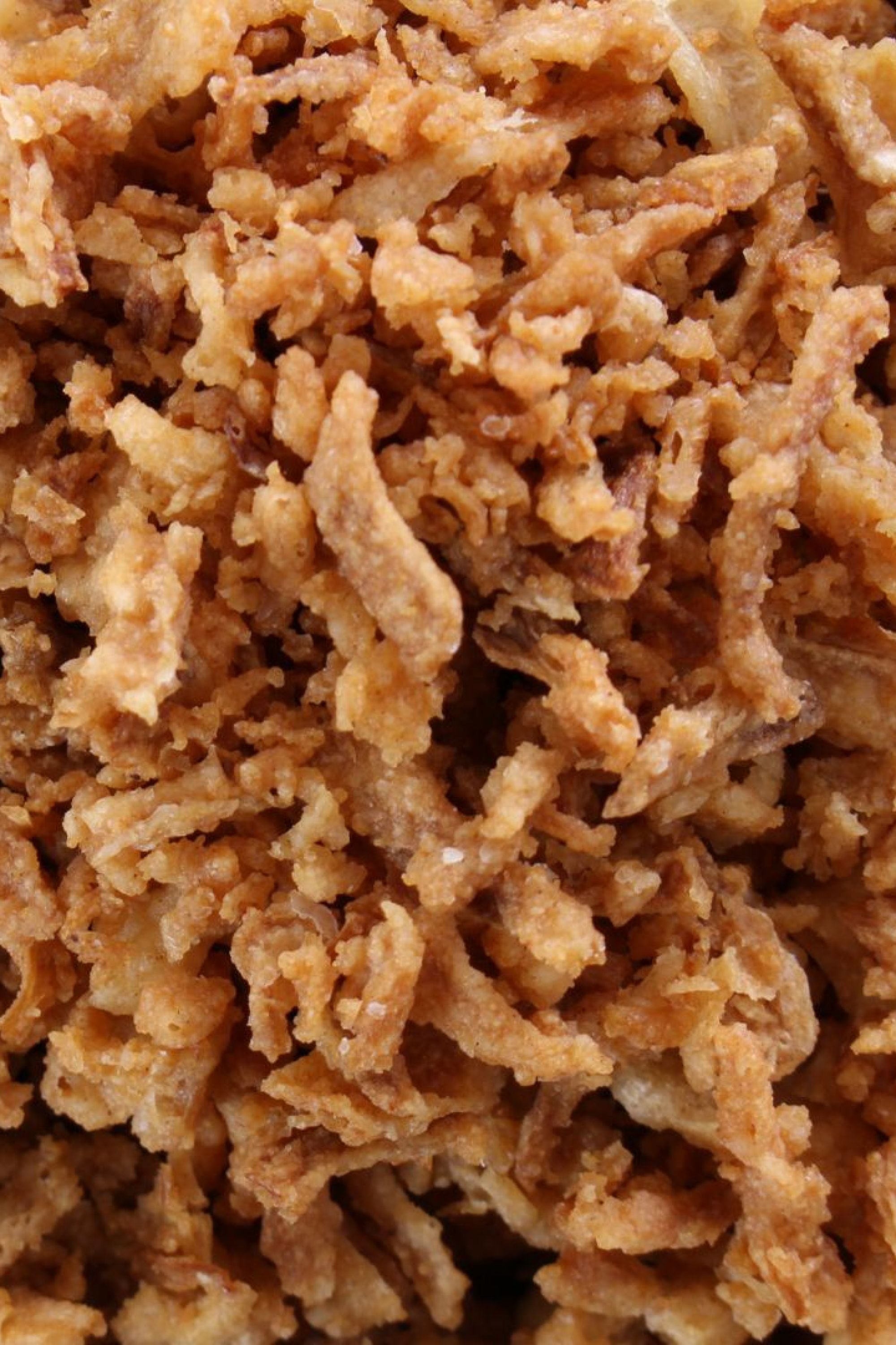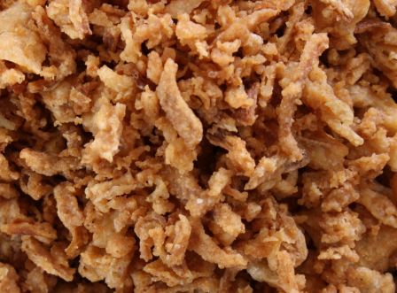 Se elabora a partir de cebollas frescas que se cortan en finas rodajas, se fríen en aceite hasta alcanzar una textura dorada y crujiente, y luego se escurren y secan para conservar su frescura. Su sabor es intenso, ligeramente dulce, y su textura crujiente añade un contraste perfecto a una amplia variedad de platos.