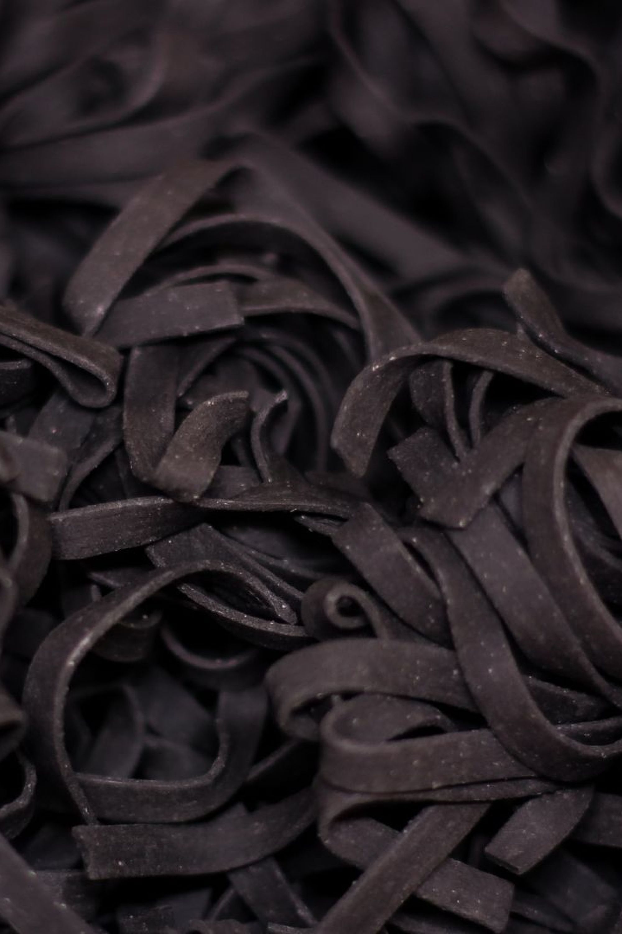 Se trata de pasta 100% bio, elaborada de manera artesanal, utilizando sémola de trigo duro y amasada con tinta de sepia, de ahí su color oscuro. Ideal para disfrutar con gambas, calamares, gulas…