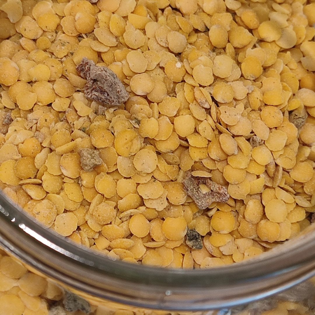 Contiene sémola de trigo dura precocida 75%, proteína texturizada de guisante 8%, semillas de calabaza, cebolla, curry (mostaza y especias), pimiento rojo y pimiento verde.