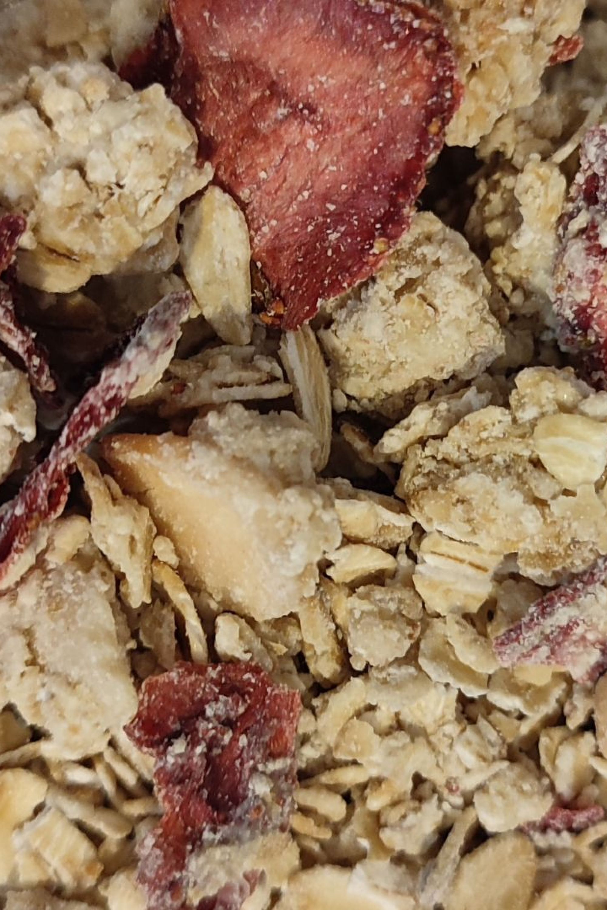 Granola con fresas, macadamia y chocolate blanco a granel. La granola más exquisita sin duda.