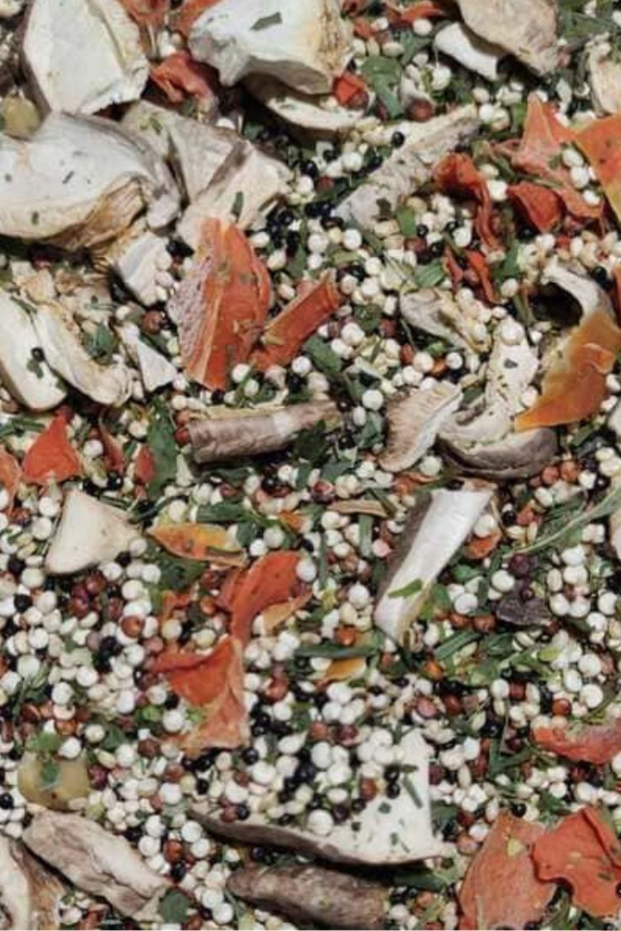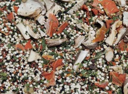 Ingredientes: Quinoa tricolor, Seta shiitake, Avellanas, Zanahoria, Puerro, Cebollino, Kale.