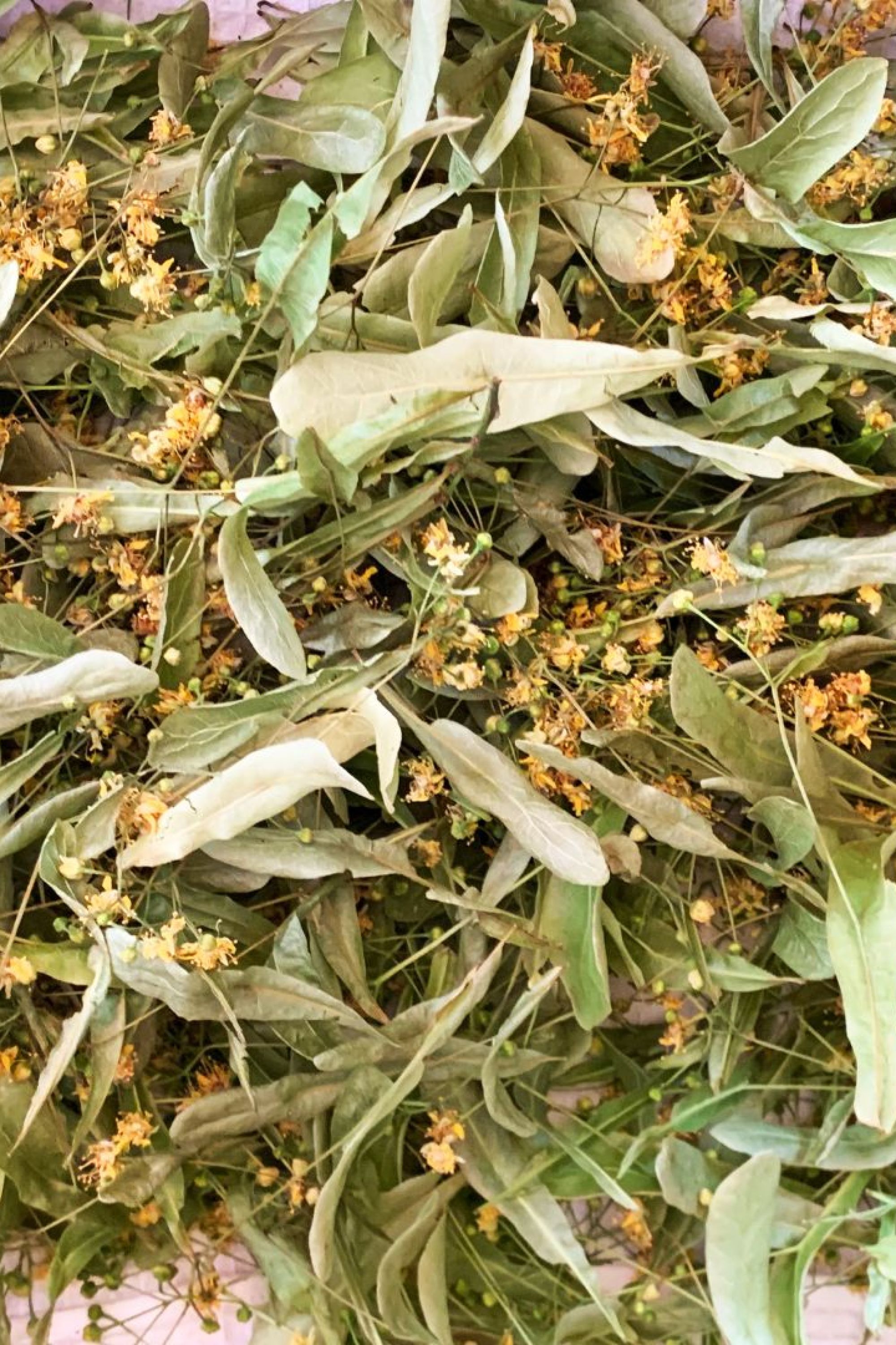 La tila se presenta en forma de hojas secas, con una textura rugosa, un tamaño medio y un color entre verde y amarillo.